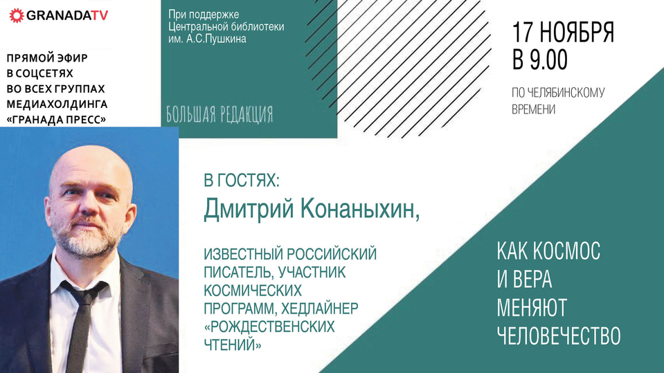 В понедельник, 17 ноября, медиахолдинг «Гранада Пресс» проведёт прямой эфир программы «Большая редакция». Гостем станет инженер, писатель, автор и ведущий программы «Российский радиоуниверситет» на Радио Россия Дмитрий Конаныхин. С журналистами ведущих изданий Челябинска он обсудит темы веры и космоса и их влияние на умы населения.